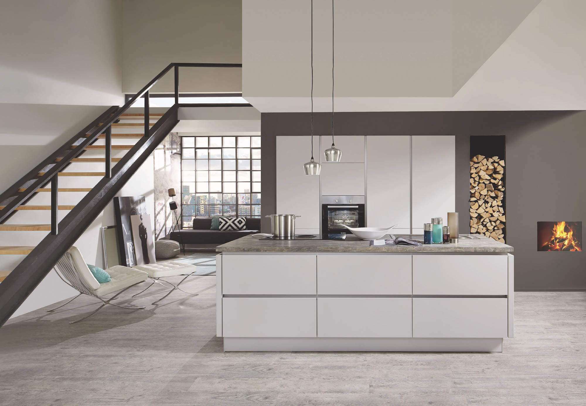 Diese Nobilia moderne Inselküche Weiß matt strahlt kühle Eleganz aus und besticht mit einem geradlinigen Design. Die Inselküche passt perfekt in das offene Raumkonzept und bringt mit ihrer klaren, schlichten und gleichzeitig edlen Ästhetik Ruhe in die Räumlichkeiten. Die matte Oberfläche, die modernen, grifflosen Fronten und die Edelstahlelemente des Backofens ergeben ein in sich stimmiges Bild, das die robuste Arbeitsplatte in Steinoptik vervollständigt.