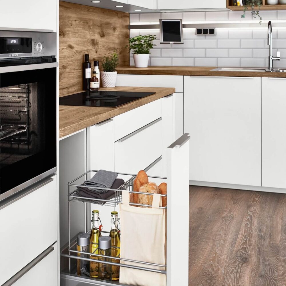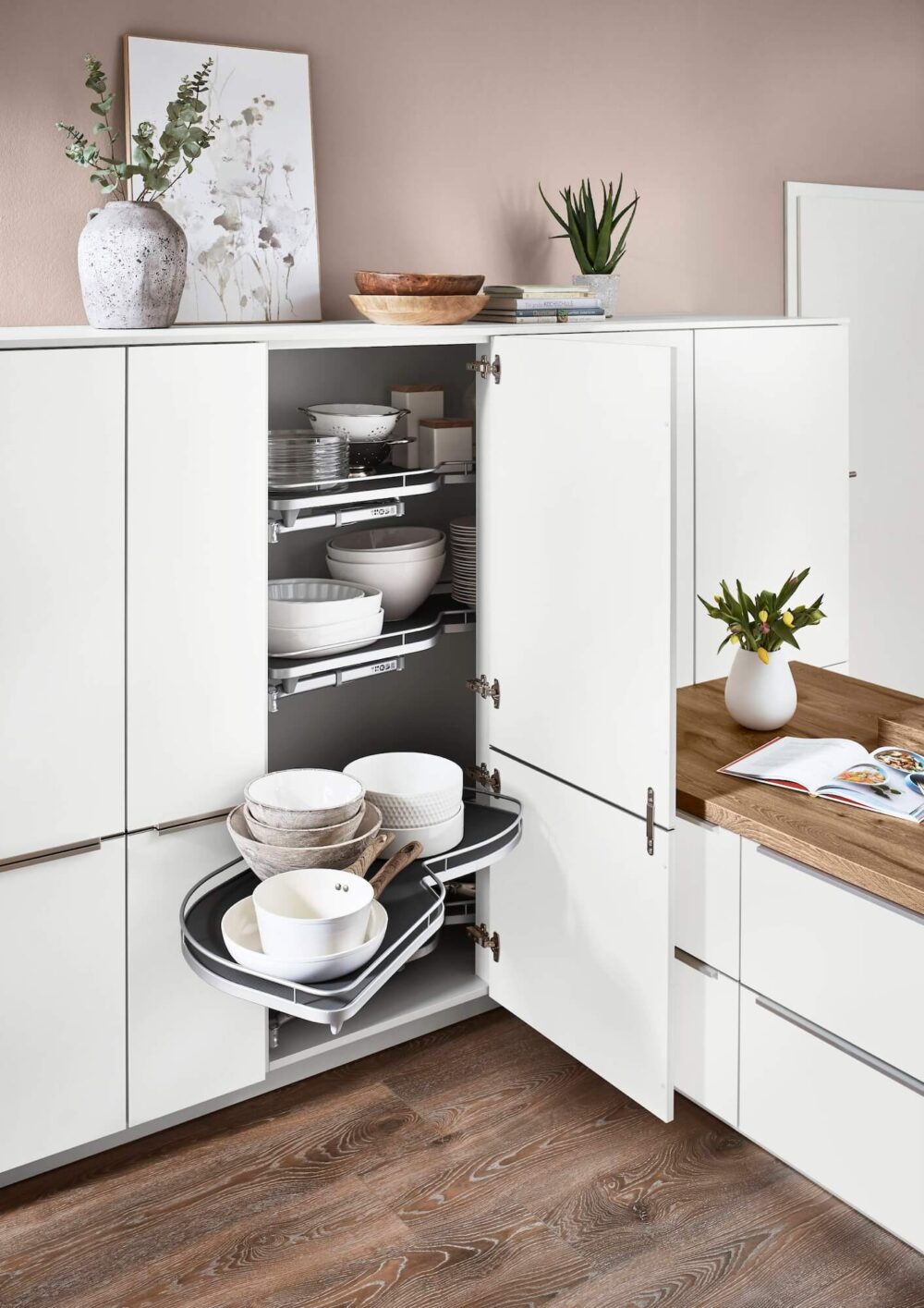 In den Hochschrank ist ebenfalls ein Regal integriert. Hier können Sie beispielsweise häufig genutztes Geschirr oder weitere Kochbücher platzieren. Zudem befinden sich Le Mans-Ausziehschränke im Hochschrank, sodass Sie bequem an Ihr Geschirr gelangen können.