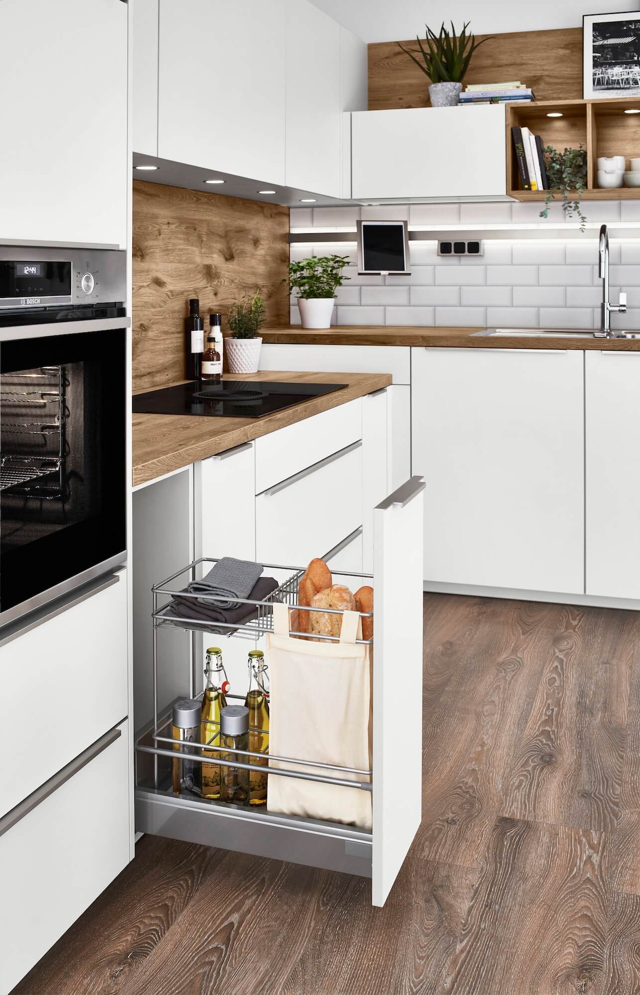 Die Nobilia Moderne L-Küche weiß mit Halbinsel ist ein wahres Statement. Die weißen Fronten harmonieren prächtig mit den Arbeitsplatten und Küchenrückwänden in Holzoptik.