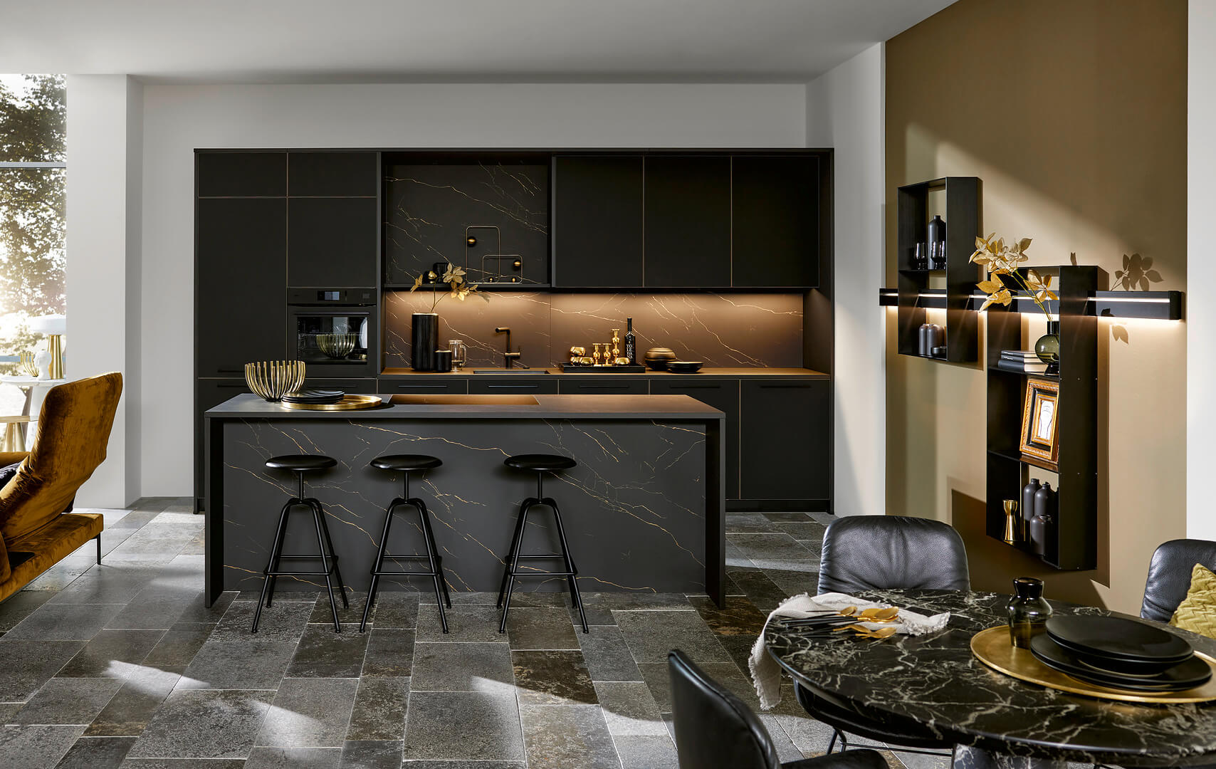 Die Nolte Design Inselküche schwarz Messing Optik vereint modernes Design mit höchster Funktionalität. Die dunkle Marmoroptik der Insel zieht sofort alle Blicke auf sowie die Wangen sind in dieser markanten Optik gehalten. Dies verleiht der Küche ein einheitliches und hochwertiges Erscheinungsbild.