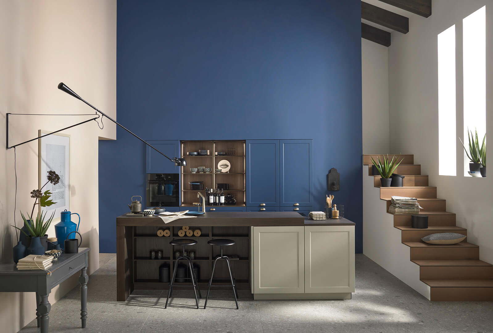 Nolte Landhaus Inselküche Greige Dunkelblau
