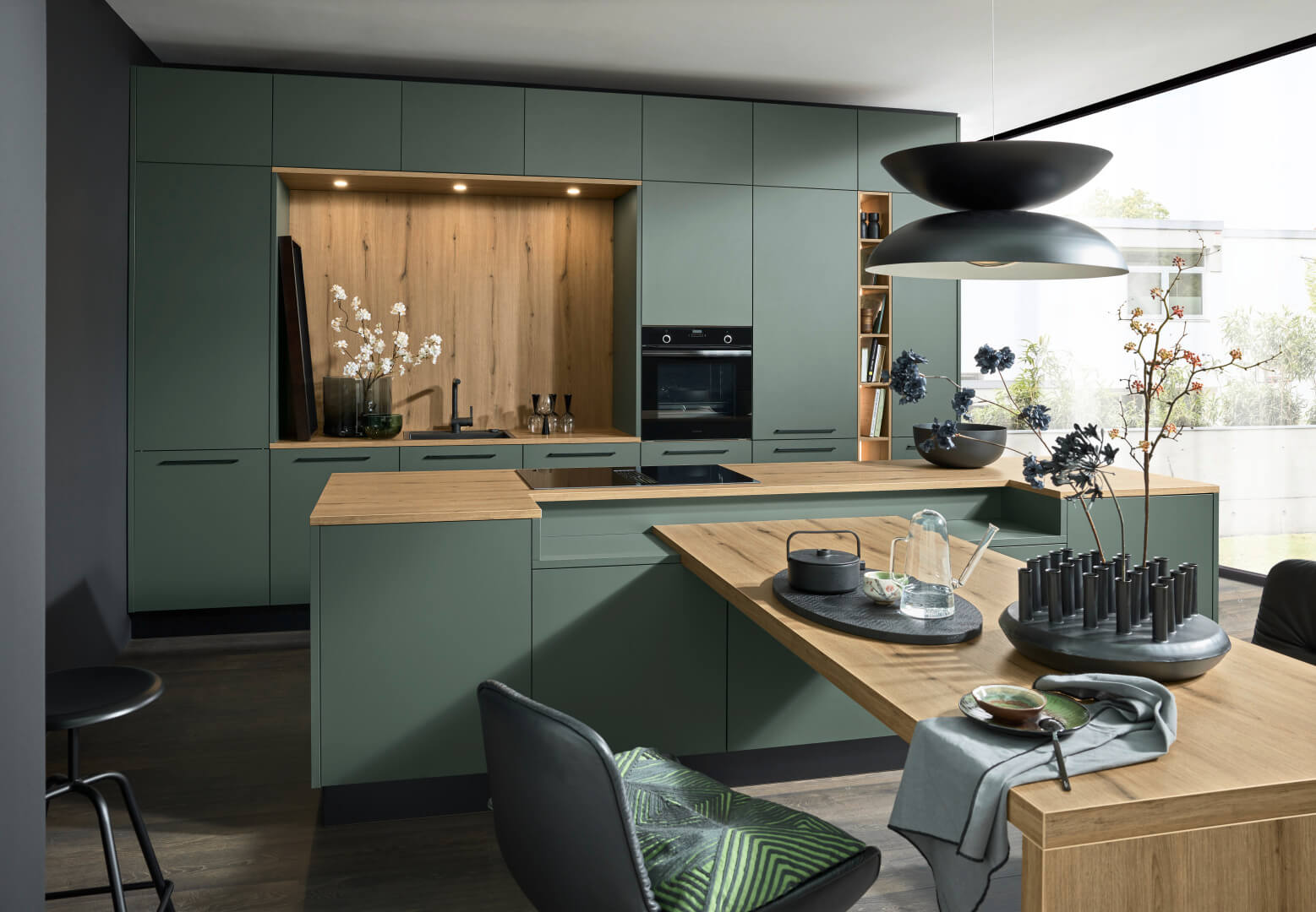Die Nolte Moderne Inselküche Grün mit Tisch vereint stilvolles Design und Funktionalität.