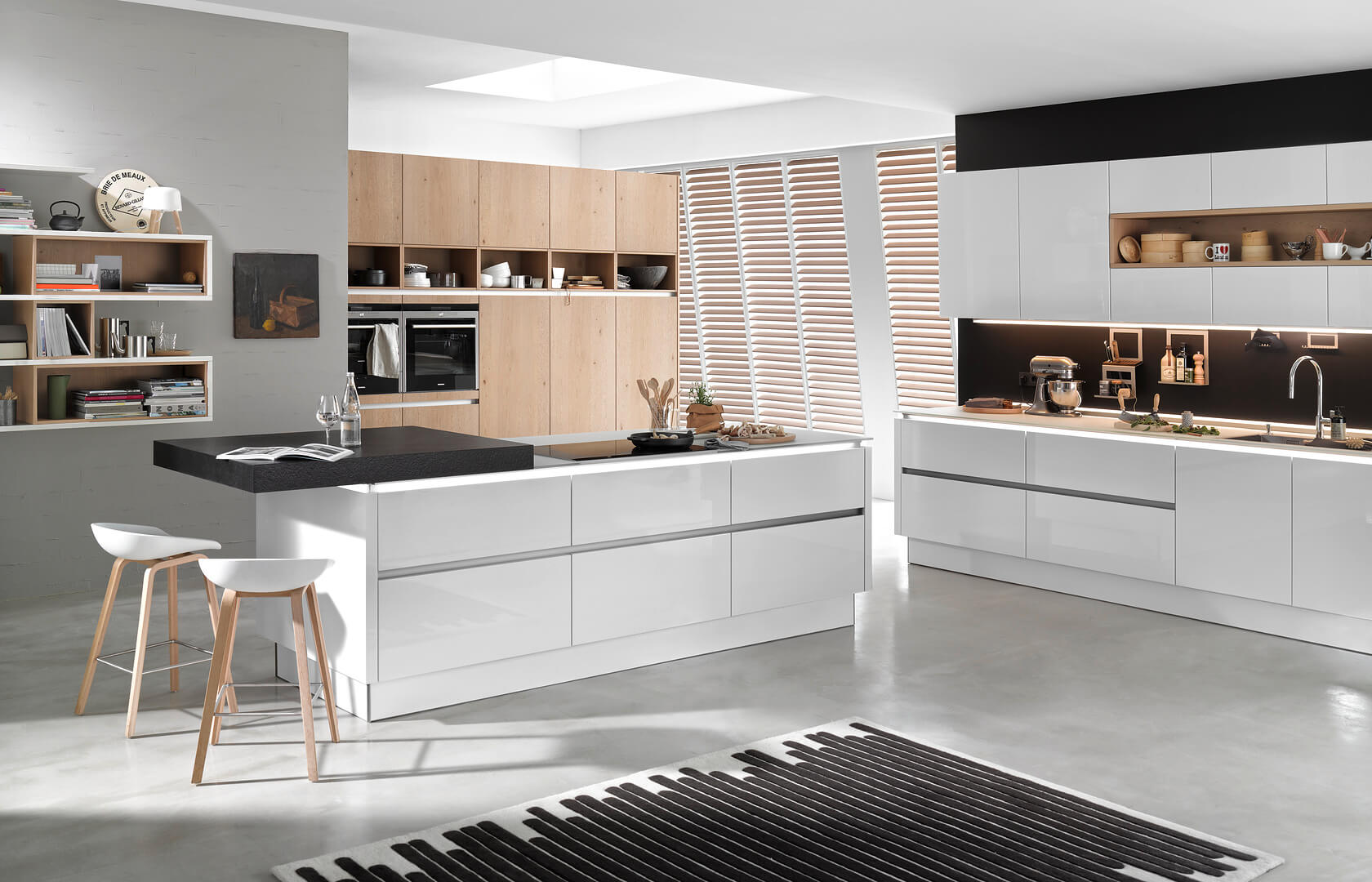 Zusätzliche Regalfächer erweitern den Stauraum für Geschirr, Vorräte und Küchenutensilien. Die Fronten öffnen mit einer Push-to-open-Technik. Dadurch bleibt die Gestaltung ruhig und grifflose Frontflächen prägen das Gesamtbild der Küche.