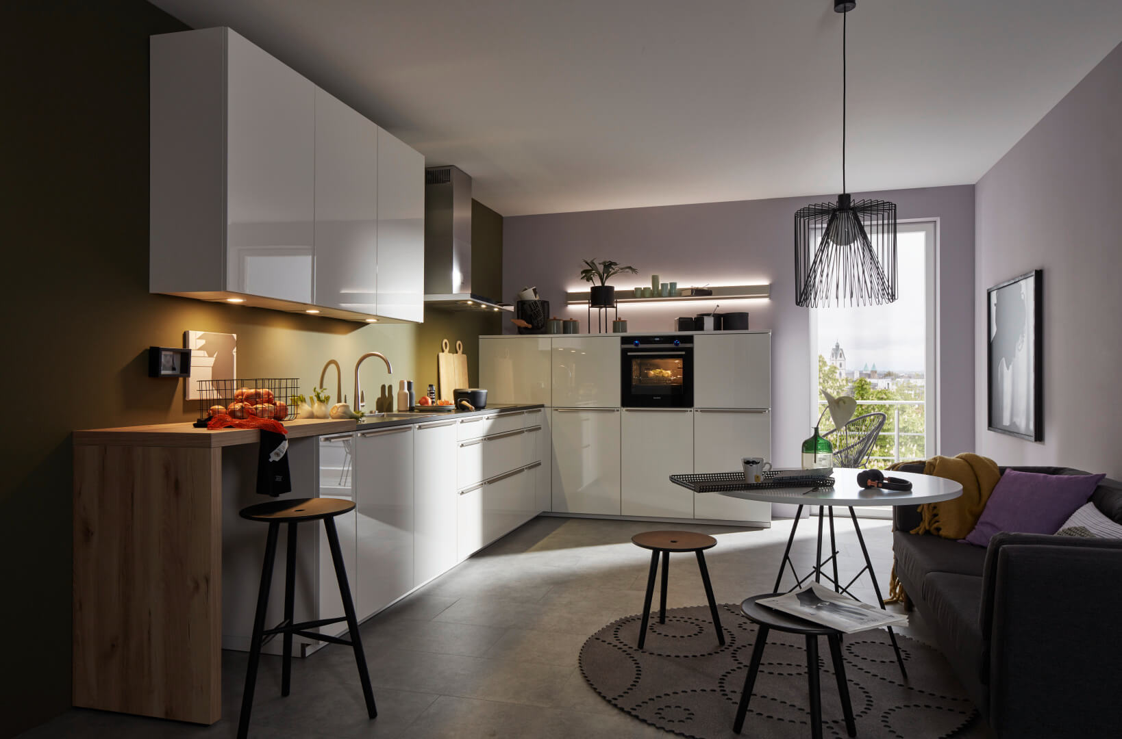 Die Nolte Moderne L-Küche Weiß Hochglanz überzeugt vor allem durch ihren großzügigen Stauraum. Mit drei Oberschränken, die nicht nur Platz für Ihre Küchenutensilien bieten, sondern auch mit Unterbaubeleuchtung ausgestattet sind, entsteht eine helle und freundliche Atmosphäre. Das Push-to-open-System für die Oberschränke ermöglicht Ihnen derweil ein leichtes Öffnen der Türen ohne Griff.